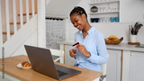 Happy, young African American woman enjoying at home and shopping online on her laptop