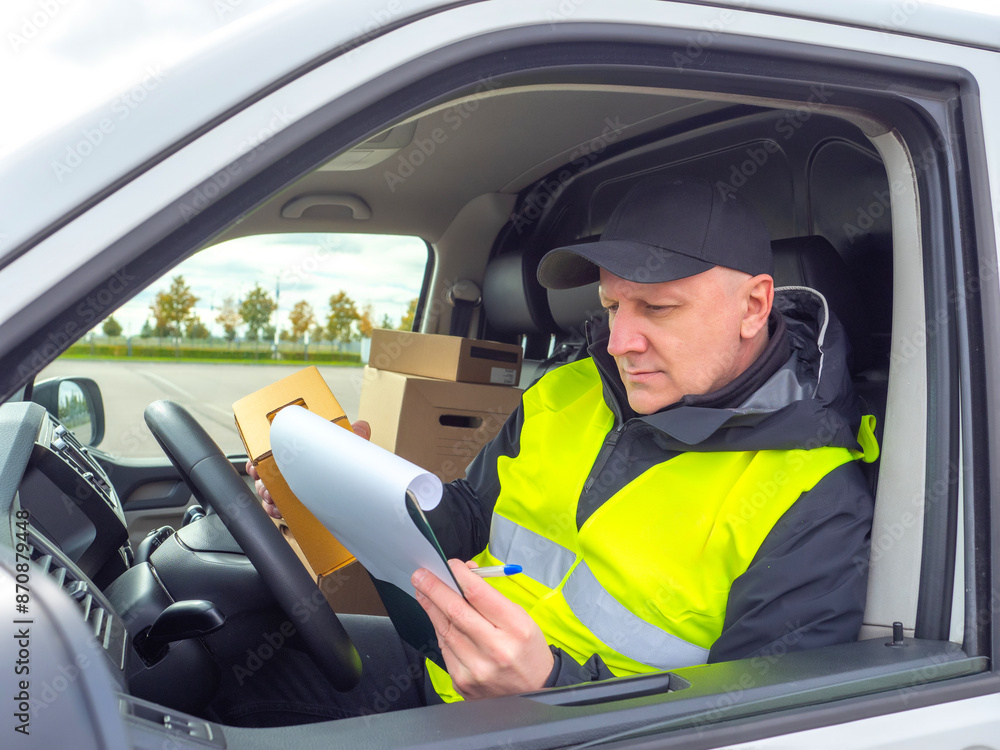 Delivery man driving. Courier truck driver. Logistics company employee. Delivery man is holding clipboard. Courier car driver. Delivery of parcels by minivan. Logistician in truck with boxes