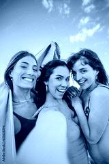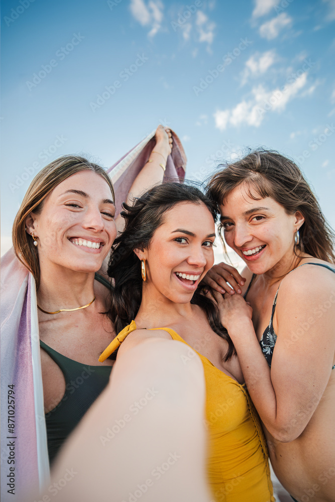 Vertical. Three young women having fun taking a selfie portrait on their beach summer vacations. Group of only females wearing swimsuit shooting a photo, enjoying a a weekend on the coast