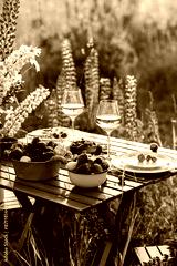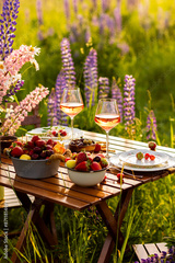 Romantic surprise, marriage proposal. Elegant decoration. Private wedding party for two, table set with floral decor, chandelier, fruits, wine in field or meadow. Summer, sunset, golden hour