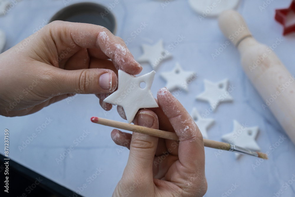 Christmas star Creator is using white air dry clay for making decor to Christmas tree holiday. Creating hobby recreation activity that involves fingers. DIY crafting Modern art