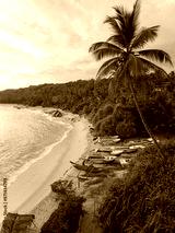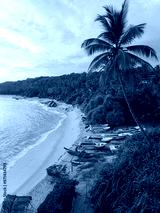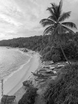 A tropical sand beach with fishing boats and palms, overgrown with jungle
