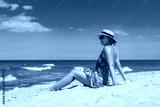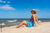 Summer holidays on the Baltic Sea. Beautiful young woman in a colorful swimsuit and a blue pareo and hat sitting on the ground on a sandy beach by the sea, looking dreamily at the horizon. Side view