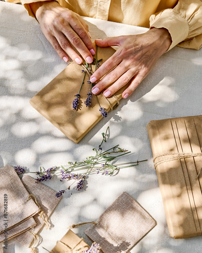 Woman making hand made gift package with craft recycled paper and dried lavender flowers on the table with linen tablecloth. Natural aesthetic.