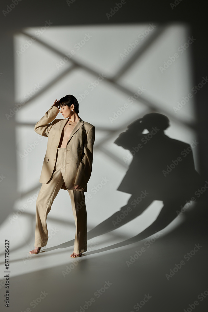 A woman in a beige suit poses against a white backdrop with geometric shadows.