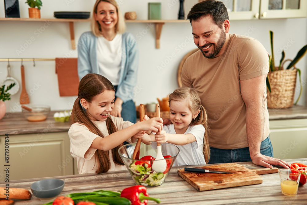 Happy Family Engaged in Preparing a Healthy Salad Together in Their Home Kitchen