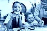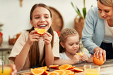 A happy family bonding over breakfast in a cozy modern kitchen, enjoying a meal together