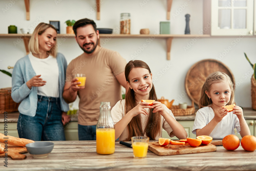 Two happy children are blissfully enjoying eating fresh oranges in a warm and inviting kitchen