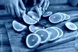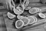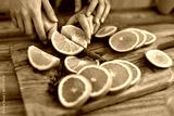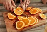 Hands expertly slicing fresh oranges on a wooden cutting board in a cozy kitchen