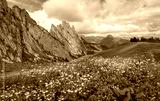 View on a beautiful alpine meadow with white wild flowers in the background, Gastlosen mountain rock formations in the background. Beautiful summer view in the Swiss Alps. Wonderful hiking and travel.