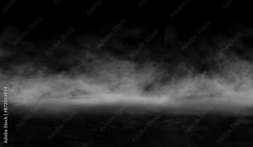 Asphalt concrete grunge floor with smoke or fog in dark room with spotlight. grungy broken asphalt night street. Mist on black background, black and white