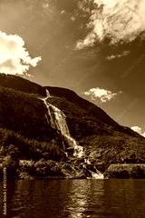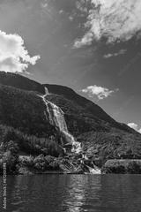 Blick auf den Wasserfall Langfossen am Åkrafjord in Norwegen