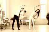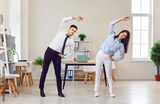 Business and healthy office lifestyle, young office workers doing fitness exercise at workplace. Happy fit business people doing side bending posture during break time, morning, healthy environment
