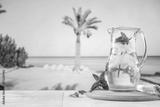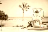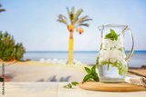 Jug of still mineral water with ice and fresh mint on wooden board table and rocky seaside and tropical beach background.
