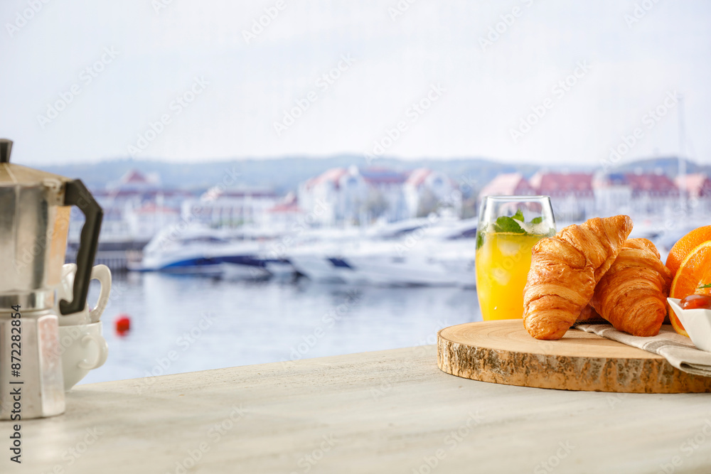 Croissant and continental breakfast concept on white wooden table with seascape background. Copy space for montage products display.