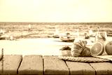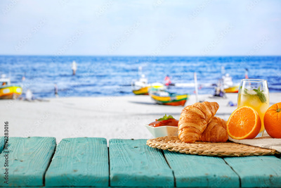 Croissant and continental breakfast concept on white wooden table with seascape background. Copy space for montage products display.