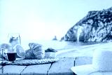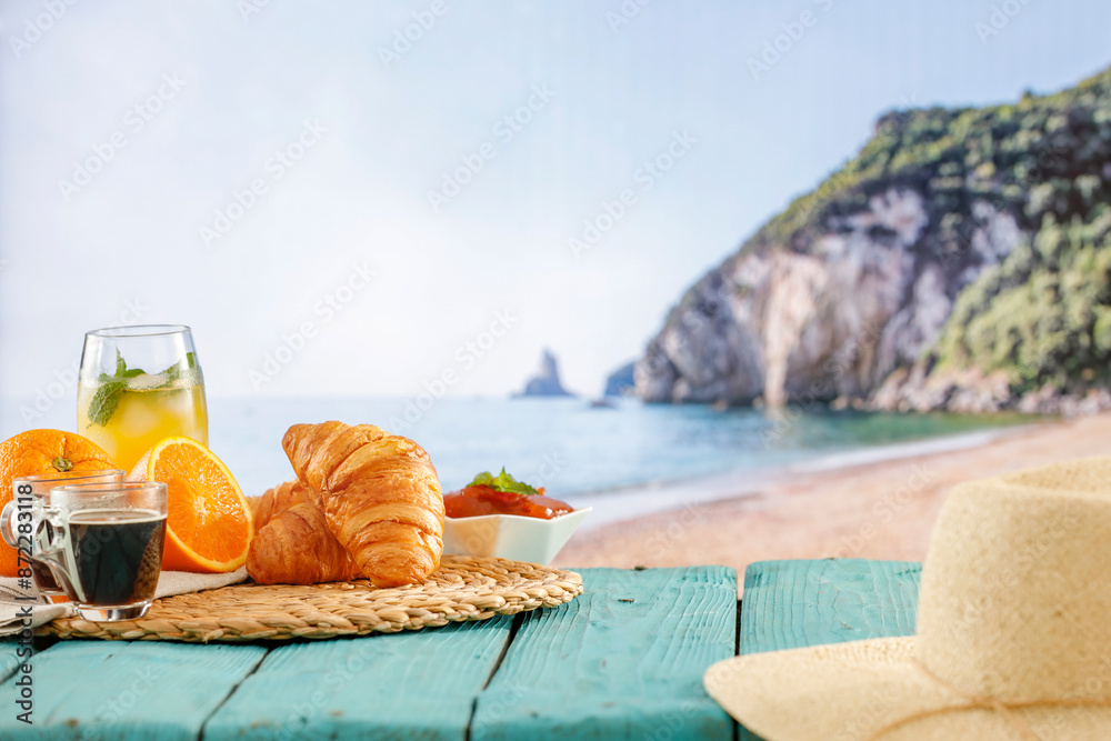 Croissant and continental breakfast concept on white wooden table with seascape background. Copy space for montage products display.