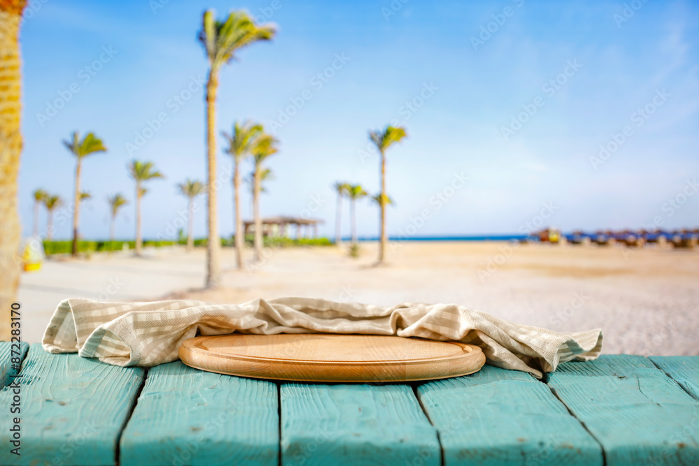 Wooden round cutting board on blue wooden table with tropical beach background and seascape.