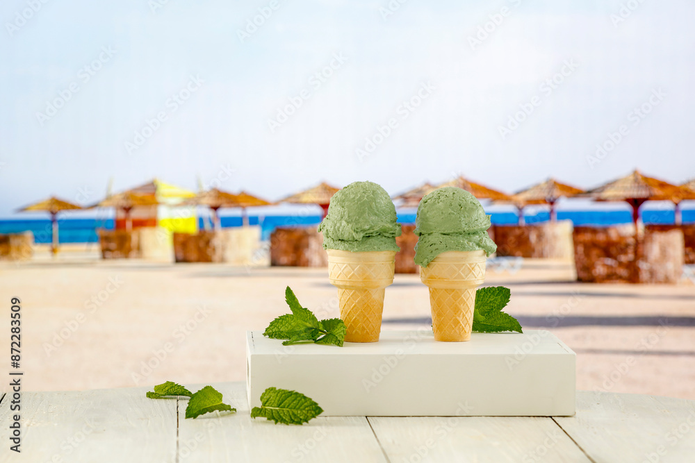Mint scooped ice cream on straw plate on wooden table on a beach. Tropical and exotic vacation in a holiday resort. Empty advertising space for products.