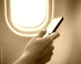 Woman Hand using cell phone in Airplane