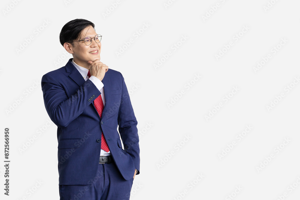 Businessman Asian model isolated on white background. Smart male in business suit expression think vision dream.