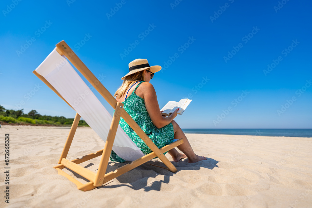 Summer holidays on the Baltic Sea. Woman of European beauty in green dress and beige hat reading book sitting on sunbed on beach with white sand on beautiful sunny day. Relaxing on beach. Side view