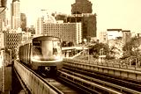 Electric train bright light railway carriage rushes turn travels along route in sunset sky railway road viaduct among the modern city of buildings, skyscrapers metropolis