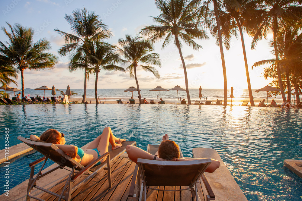 beach holidays for couple in luxury hotel, banner background with copyspace, man and woman relaxing near swimming pool at sunset
