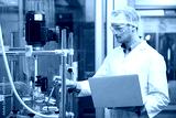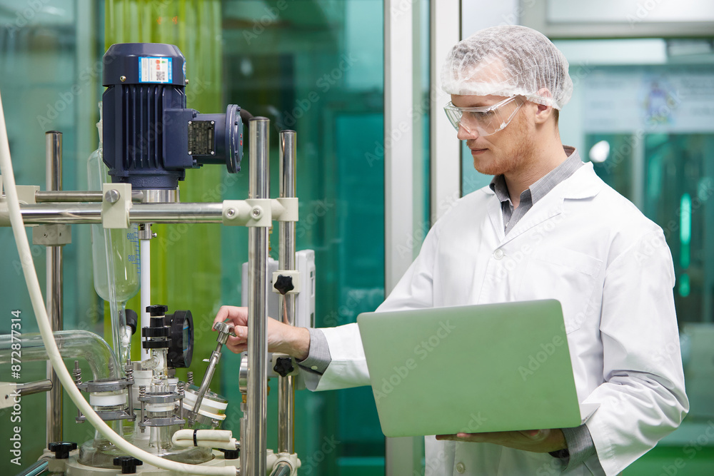 scientist using laptop computer for operating machine in cannabis testing lab