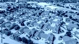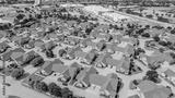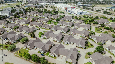 Premier active adult communities and nursery homes with commercial building warehouse background in upscale West Plano, Texas, condominium duplex with maintenance-free lifestyle, aerial view