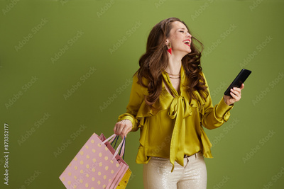 happy healthy woman in green blouse on green background