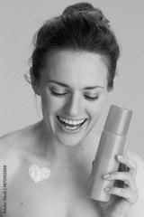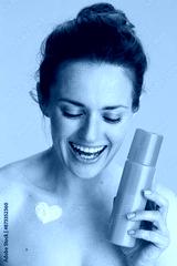 smiling young woman with cosmetic cream jar