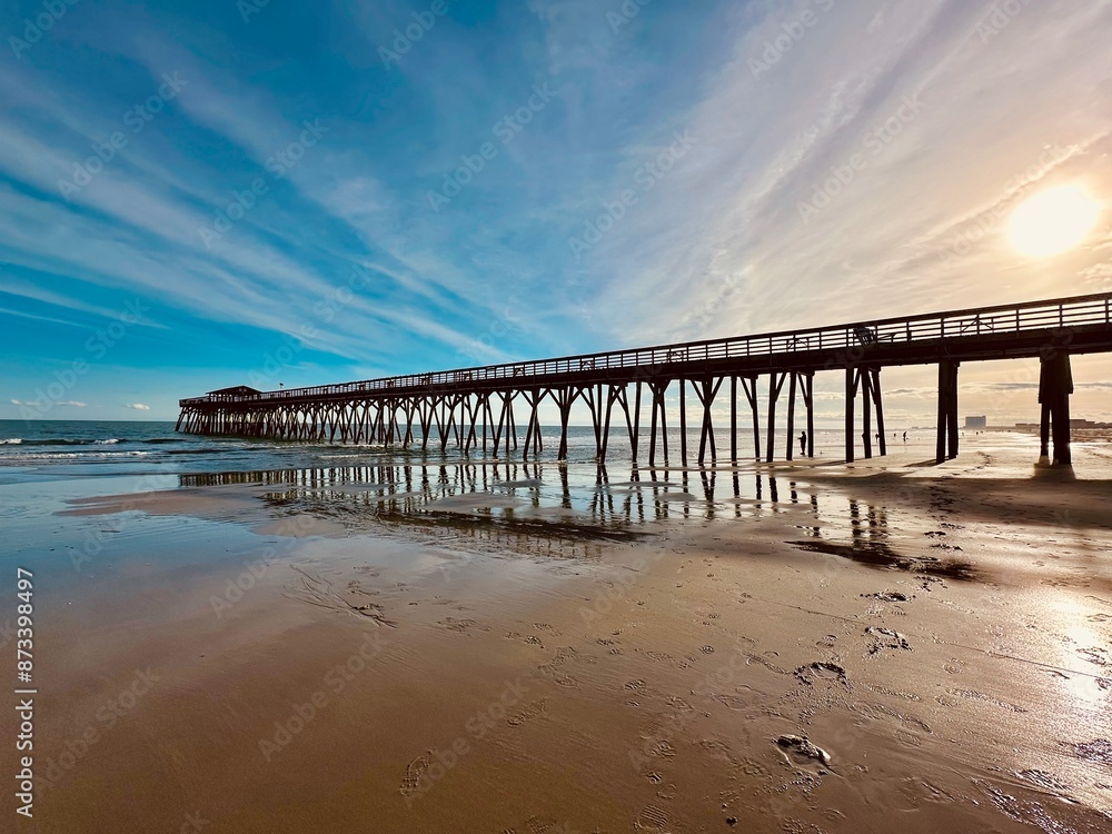Wooden pier into ocean in the Myrtle Beach State Park, Horry County, South Carolina. Fishing pier