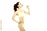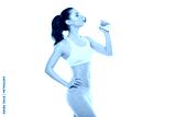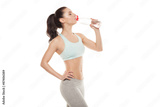 Sporty girl drinking water from a bottle after a workout, fitness training, isolated on white background