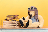 Teddy Bear toy in leather aviator's hat and vintage goggles, wooden plane front yellow wall background. Retro old style filtered photo