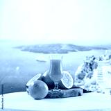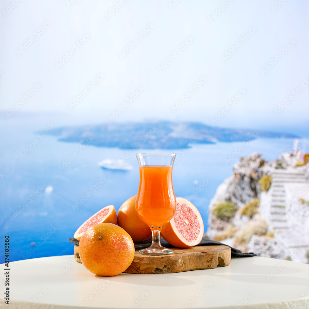A glass of orange juice on the table with grapefruits on wooden table and seascape background.