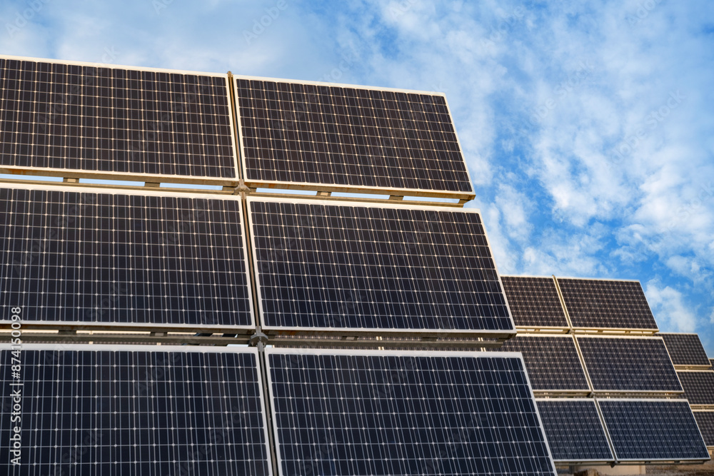 Rows photovoltaic panels stretch across solar farm, capturing sun's energy for sustainable future, Solar farms clean energy, generating electricity from sun's rays