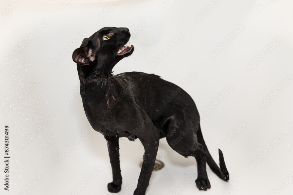 Black funny cat wet in bath, black purebred oriental cat washing