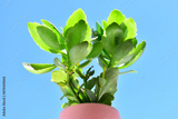 Green leaves of a plant in the pink pot on a blue sky background on a sunny day. Succulent close up. Summer bright background. Beauty in nature.
