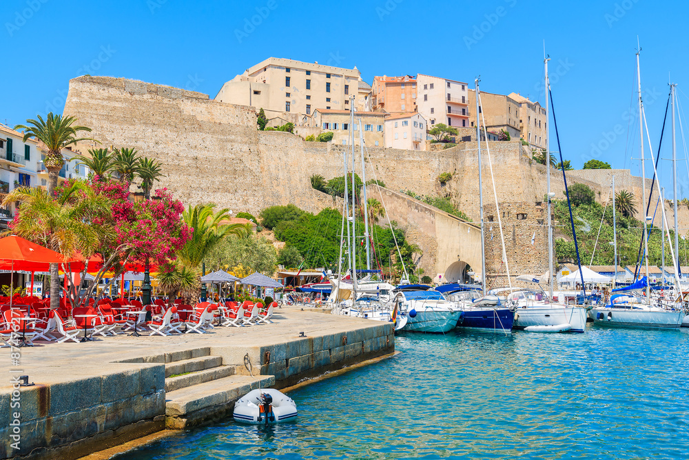 View of sailing boats and citadel with houses in Calvi port, Corsica island, France
