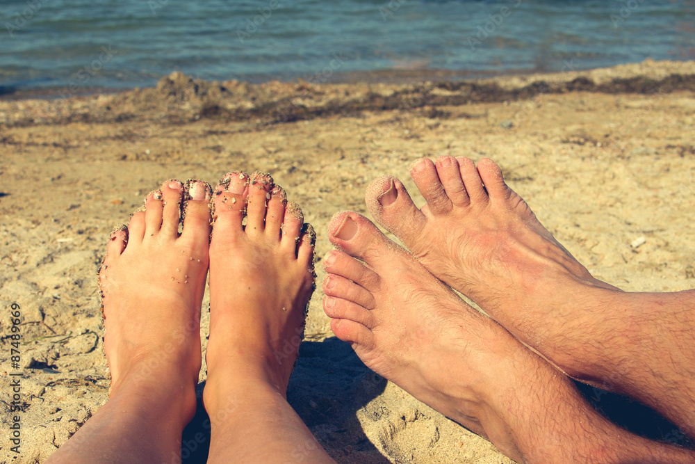 Female and male feet on the background of blue sea. couple lying and resting on the beach. The concept of a man meets a woman - a holiday romance.