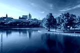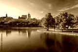 Old Port of Montreal in autumn. Red maples and old Montreal skyline reflected on St. Lawrence River. Fall foliage season in Montreal, Quebec, Canada.