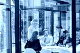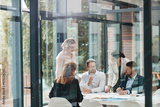 Window, business people or planning in meeting for paperwork, teamwork or collaboration together. Shareholders, investor or executive director speaking in discussion for feedback, review or project