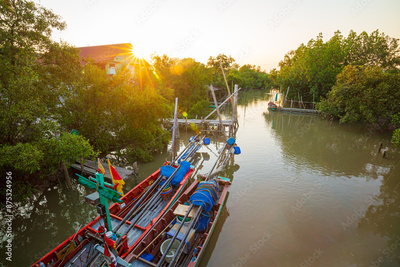 Small fishing boats and mangrove forests,Small fisheries boat in the mangrove forest