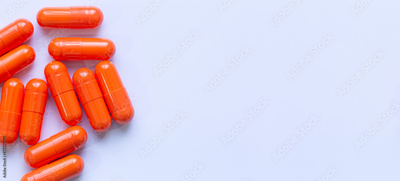 Orange pill capsules isolated on white background,Medicine background. Orange pills isolated on white. Pile of capsules. Tablets background. Vibrant vivid color drugs. Antibiotics background.