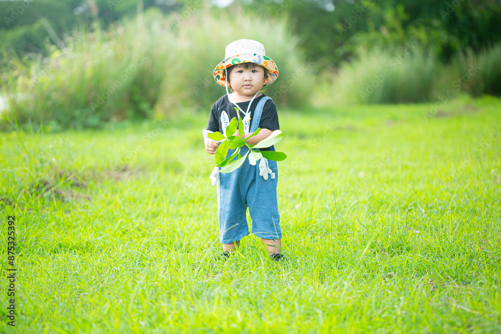 Toddler taking a walk in the green meadow,Toddler taking first steps in a park
