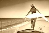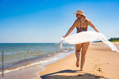 Summer vacation. Beautiful young woman in colorful swimsuit and beige hat and sunglasses walking with white scarf fluttering in wind on sandy beach on beautiful sunny day. Back view