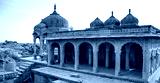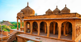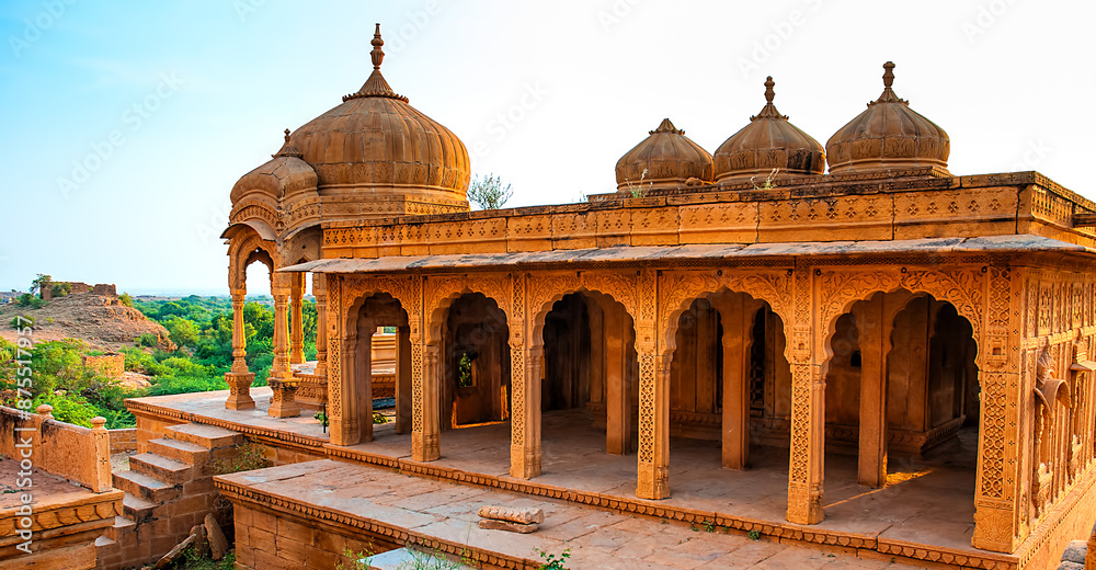 The royal cenotaphs of historic rulers, also known as Jaisalmer Chhatris, at Bada Bagh in Jaisalmer, Rajasthan, India. Cenotaphs made of yellow sandstone at sunset