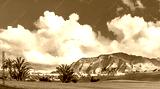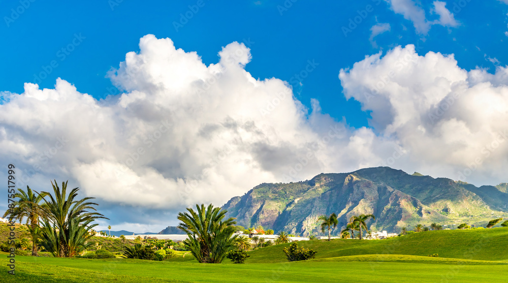 Amazing view of green lawn of a golf course with palm trees, mountains on the background. Location: Buenavista del Norte, Tenerife, Canary Islands. Artistic picture. Beauty world. Panorama