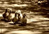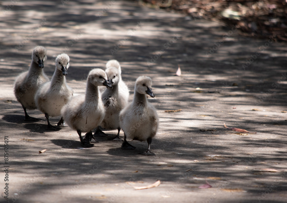 the cygnets are walking along a path